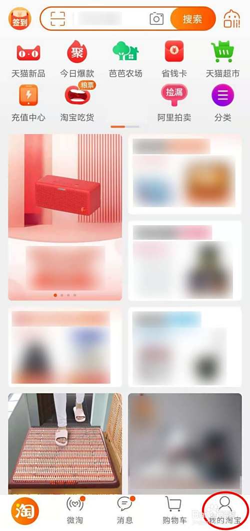 打开淘宝APP首页,服务在上,商品在下,选择右下角我的淘宝;