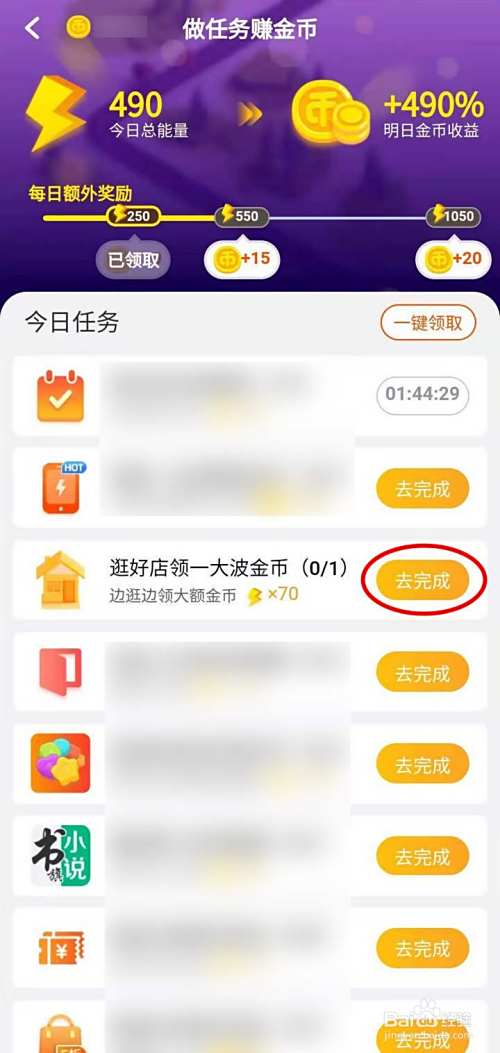 打开任务页面,任务较多,选择逛好店领一大波金币右侧的去完成;