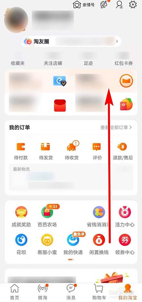 打开我的淘宝页面,除用户基本信息外,就是各种服务,上滑页面;