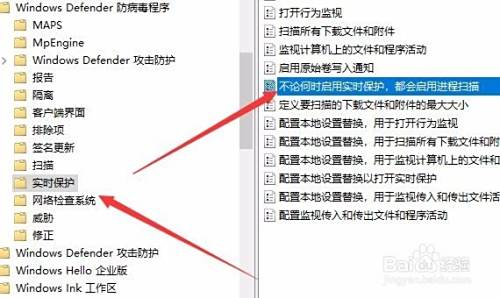 接下来在展开的菜单中找到“实时保护”菜单项,在右侧窗口中找到“不论何时启用实时保护,都会启用进程扫描”设置项。