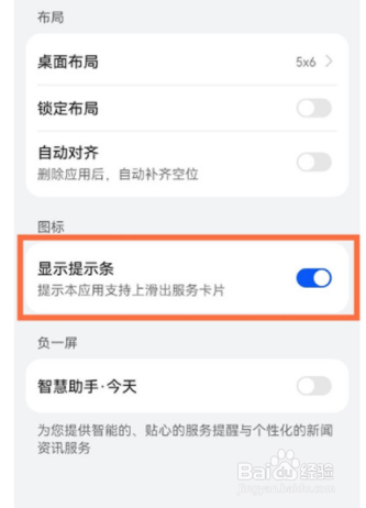 3、进入桌面设置之后,在图标下面找到显示提示条选项,把右边的滑块点成灰色即可。