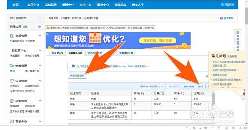 点击进入“运费模板设置”后,在箭头所指的地方,就可以分别进行增加新运费模板,和修改现有的运费模板。
