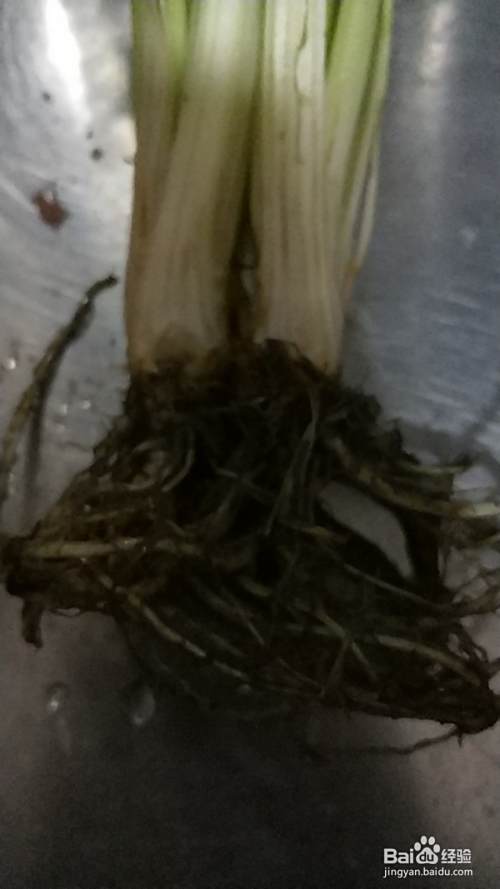 从芹菜根部切下五厘米,不要弄断根须,轻轻抖落根上的泥土。