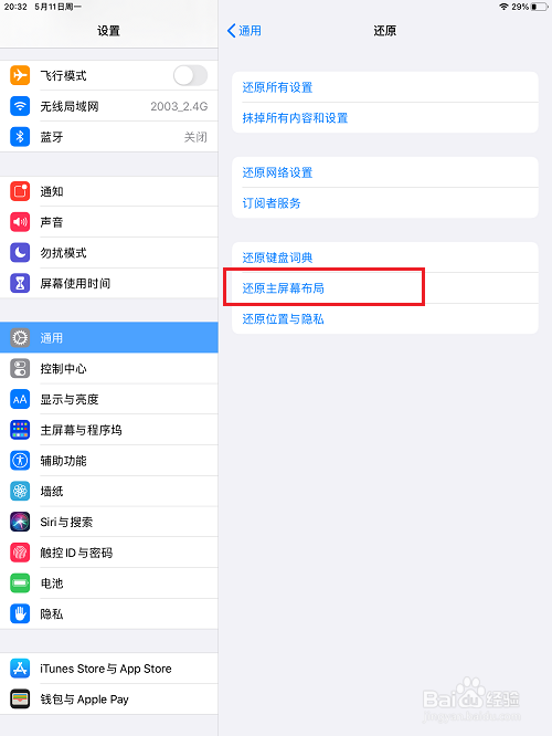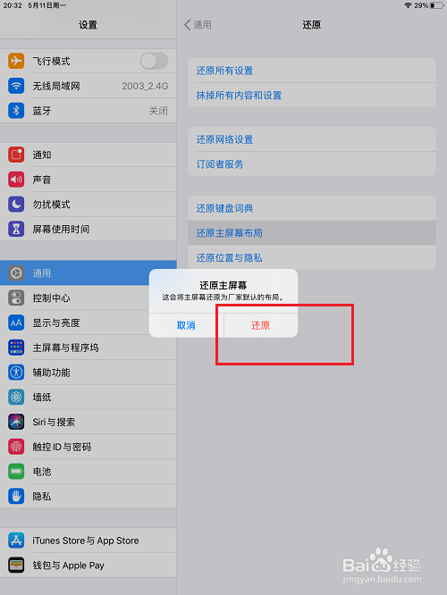 第五步弹出框之后,点击还原,就成功恢复ipad默认桌面布局了