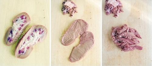 猪腰剥去外边的膜,对半切开,里面白色和深红的部分要全部去掉。不要舍不得,一定要全部去掉。