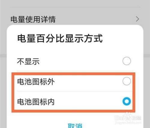 3、勾选【电池图标外】或【电池图标内】即可。