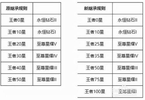 既然段位有所变化,那么继承规则自然也要调整,但新赛季中只调整了王者20星或以上的段位,其他段位的继承规则和原来保持一致,如下图所示: