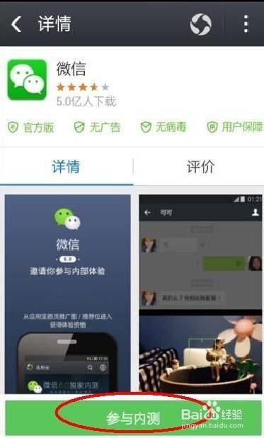下载好应用宝后,就可以看到微信6.0下载了。点击“点击参与内测”下载即可。