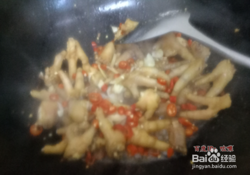 把准备好的鸡爪放入热锅,翻炒。放入少量指尖椒