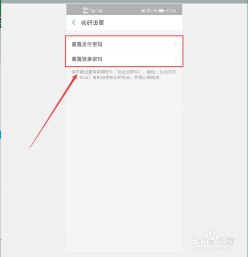 在打开的页面中可选择“重置支付密码”和“重置登录密码”。