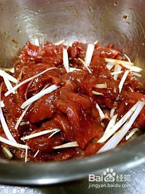 牛肉先加入糖、姜粉用手抓匀后再加入酱抽、香油、白胡椒粉和葱丝,拌匀后静置20分钟入味。