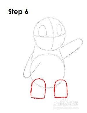第6步:在身体下方,再画两个形状作为Charmander脚部的指南。这些形状也应该是带有线条的弧形,类似于眼睛,但是在顶部较宽。