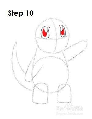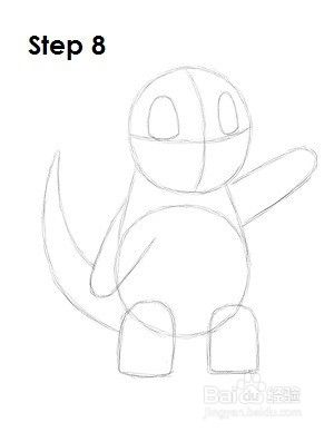 第七步:在身体左侧画两条曲线作为Charmander尾巴的指南。其中一条线从手臂引导开始,其他线从脚引导开始。然后,这些曲线向上弯曲并到达头部左侧的一个点。