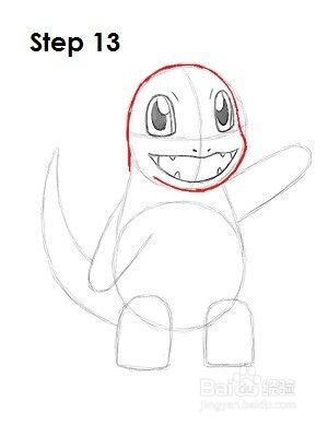 第13步:使用原来的圆圈作为指导绘制这个宠物小精灵角色的头。当你变暗线时,按照圆的基本路径。当你到达眼睛右侧时,让Charmander的头部变窄。