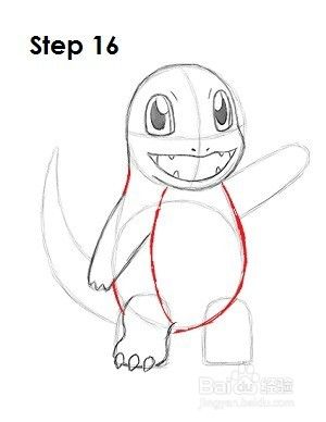 第16步:变暗初始形状的线条以创建Charmander的身体。身体的线条不应与左侧的手臂和脚部重叠。在Charmander的身体内画一条曲线用于分色。