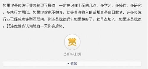 新浪微博打赏功能出来有几个月的时间了,对于那些有名的新浪自媒体可以说是非常的不错,而且很多人也通过微博打赏功能得到了粉丝们的打赏。打赏的金额没有限制,几元,几十的都可以。比如你在新浪微博发表一篇长微博,你的粉丝感觉文章写的不错的话,就可以通过微博打赏功能给你打些钱。