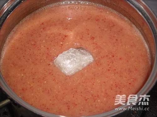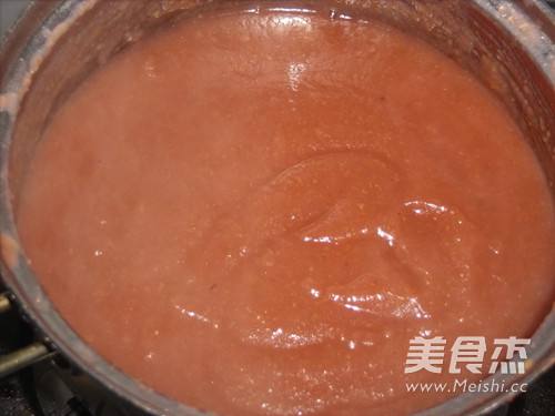 搅拌好的山楂泥倒入锅中,放入冰糖煮