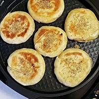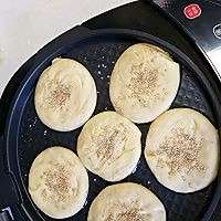 将剂子放在电饼铛,按压成想要的大小薄厚,中间点上芝麻。进行烤制。