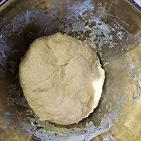 温水化开酵母粉,静置一分钟。 面粉中打入鸡蛋两颗,搅拌至絮状,用手和面至如图状态。