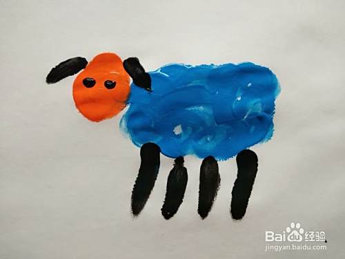 第五步,继续用黑色颜料在绵羊身子下方画四条长度粗细一致的粗条,当绵羊的腿, 这样一个简易的小绵羊就涂好了,是不是很简单呢,大家也尝试一下吧。