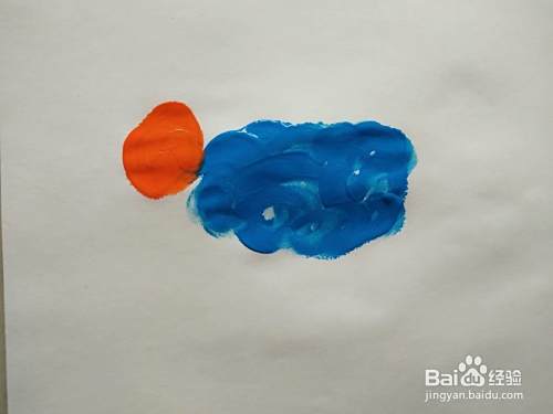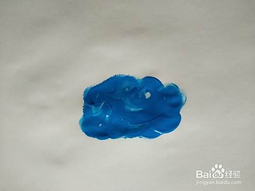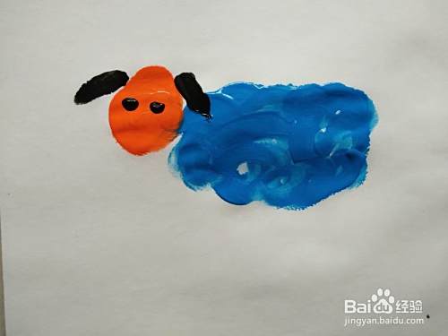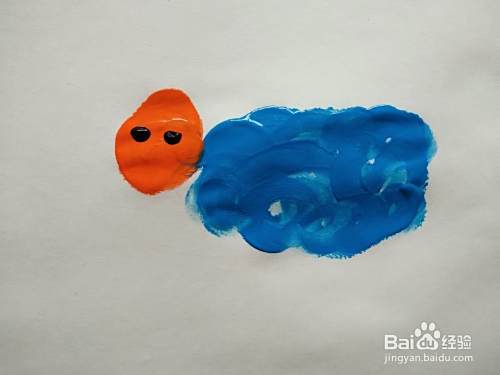 第二步,用右手手指蘸取蓝色颜料在纸上以画圈的方式涂成一个类似长方形的身子(如图所示),面积较大可以蘸颜料多涂抹几次,然后将手用湿巾擦干净进行下一步