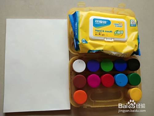第一步,准备好要用到的工具,颜料,湿巾,白纸,然后将手洗干净,准备开始喽
