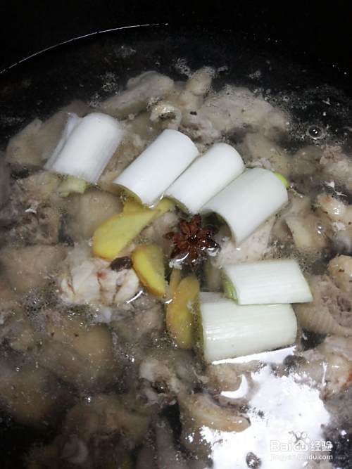 重新在锅内加水,放上鸡块,倒入少许料酒,放上葱段,姜片,洗好的枸杞也放上开始炖。