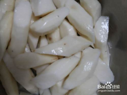 炖上鸡后,把山药削皮,切段备用。可以将切段的山药浸泡在水里,以防氧化变色。