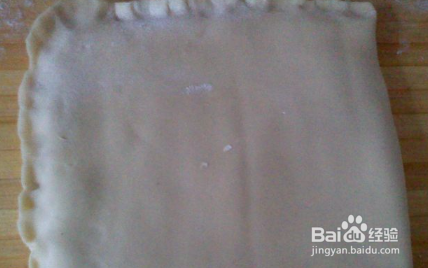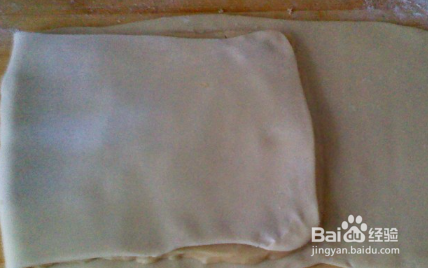 然后将油面放在面皮的中间摊平,然后将左侧的面折到油面上。