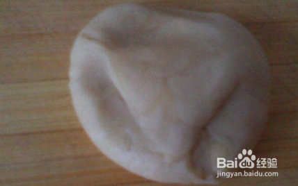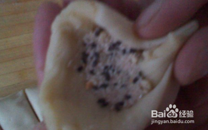 切成小剂子,用手将剂子捏扁,然后放入调好的馅。