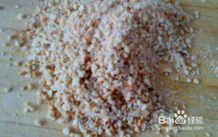 将200g的生粉放入锅中炒熟备用,一勺碎花生,两勺糖放入碗中。