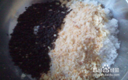 用擀面杖将花生擀碎,黑芝麻用电饼铛烤一下备用。