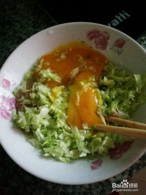 鸡蛋,白菜,肉,加适量盐,料酒(一丁点就可以了,我这里加多了点。吃起来料酒味比较明显)搅拌均匀!