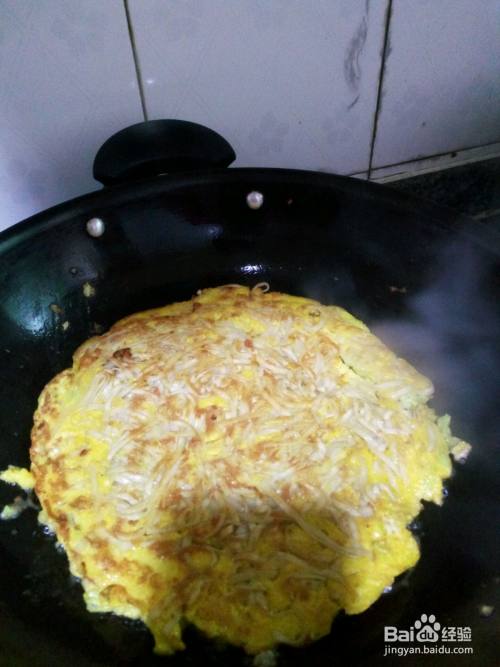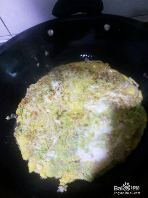 然后借助工具翻过面饼,煎直肉熟蛋熟,菜熟。面饼略焦(看家里什么厨具能帮忙翻面),