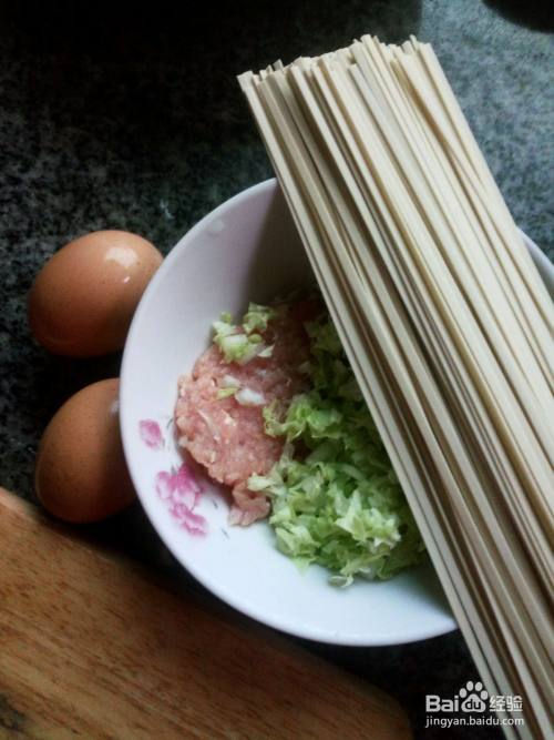 鸡蛋2-3个打到碗里(有菜有肉3个鸡蛋,没菜有肉2个鸡蛋),白菜叶切碎,猪肉剁细。准备适量面条。锅里烧水!