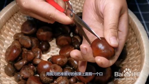 提前准备大小两种板栗,用剪刀把准备好的板栗上面剪一个口。
