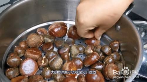 准备好的板栗用剪刀剪一个口子,然后把板栗放入到锅中,开火蒸板栗,蒸12分钟后需要把里面的小板栗捞出,大板栗再次蒸20分钟的时间就可以了。