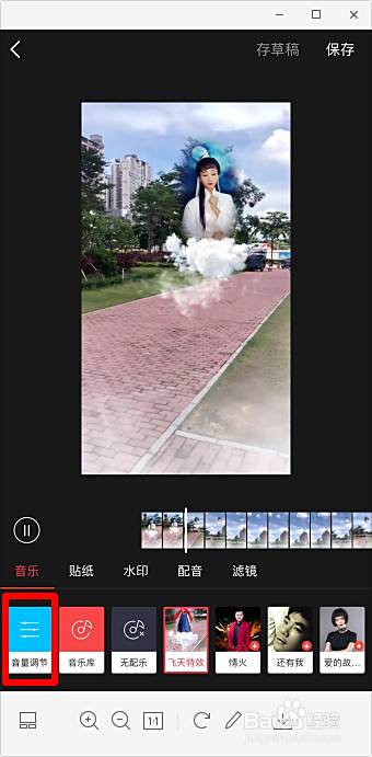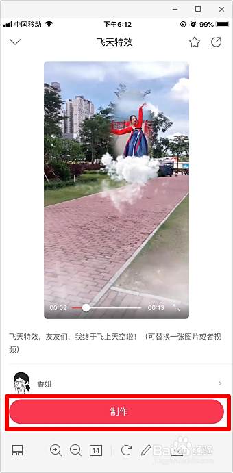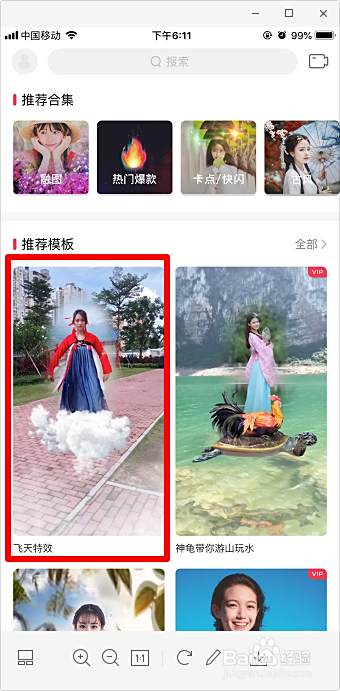 打开逗拍,点击“飞天特效”模板,如果没有,可以搜索。