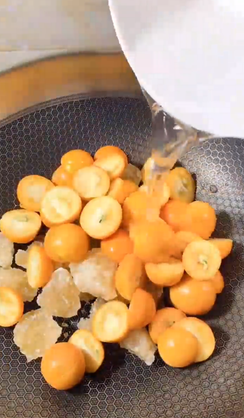 锅中放入黄冰糖、金桔、清水。