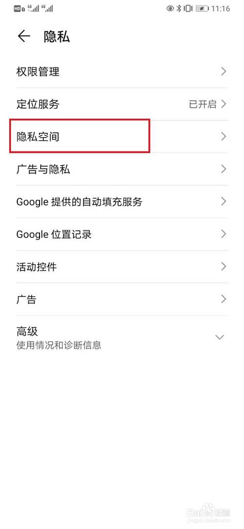 进入隐私页面,选择打开【隐私空间】选项,如下图所示。