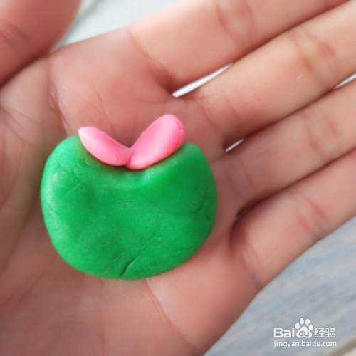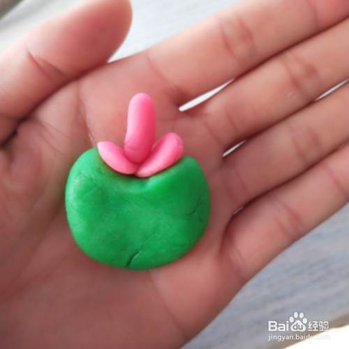 如图,再做一个红色的小条状橡皮泥粘在绿色橡皮泥的最上端。