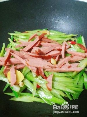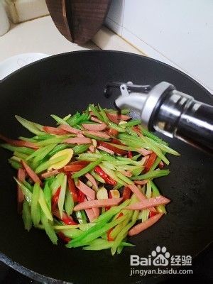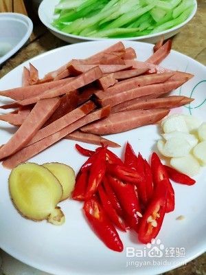 芹菜切斜刀,香肠用的是蒜香烤肠,切丝,姜蒜辣椒切片。