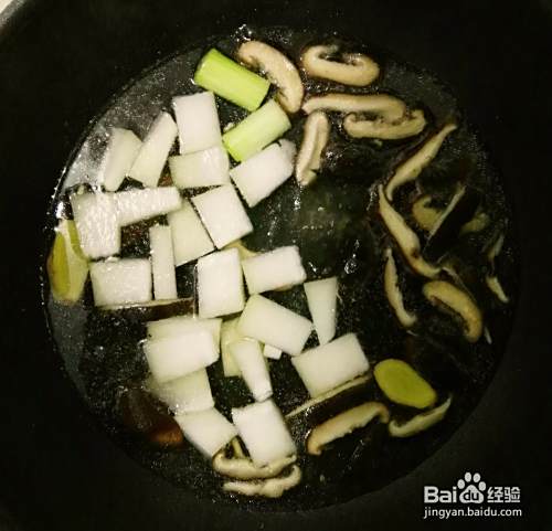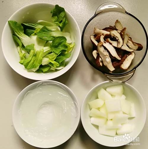 香菇洗净切片,冬瓜去皮切片,粉丝洗净泡软,油菜洗净