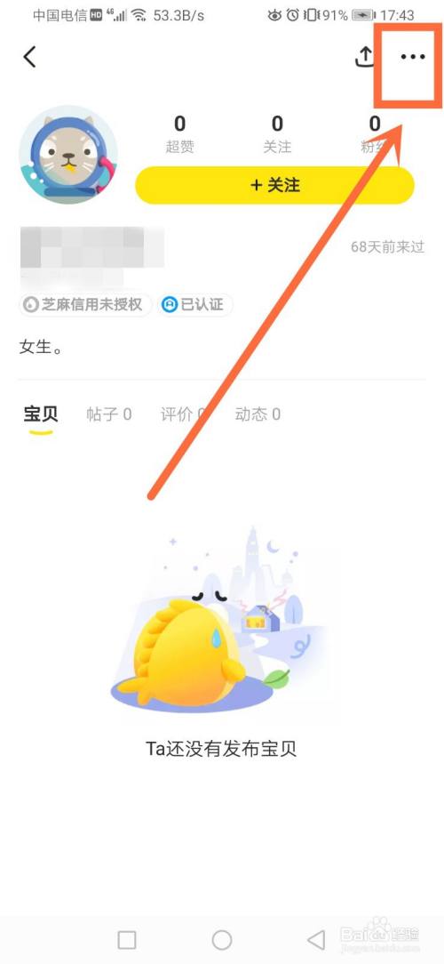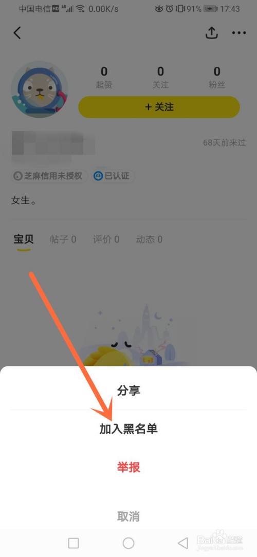 进入后,即可【看到只能对该用户进行举报和加入黑名单,无法进行私聊的】了。这样我们就知道闲鱼别人没发布宝贝是不能进行私聊的了。如下图所示