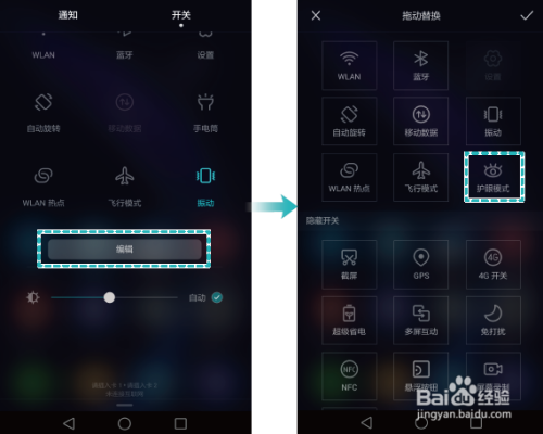 如果【护眼模式】没在常用开关中,您还可以在快捷开关页面,点击【编辑】,将【护眼模式】开关拖动到常用开关中,方便后续操作。