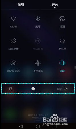 当然,还有一个比较快捷的方式,从状态栏处向下滑动,打开通知面板,在【开关】页签中,大家可以看到一个屏幕亮度调节轴,后面有一个【自动】选项,点击此按钮,同样可以开启手机屏幕亮度自动调节功能哦~