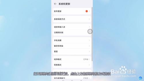 在系统与更新设置页面中选择导航方式,选择悬浮导航并将其设置为关闭即可,以下是详细的操作步骤: