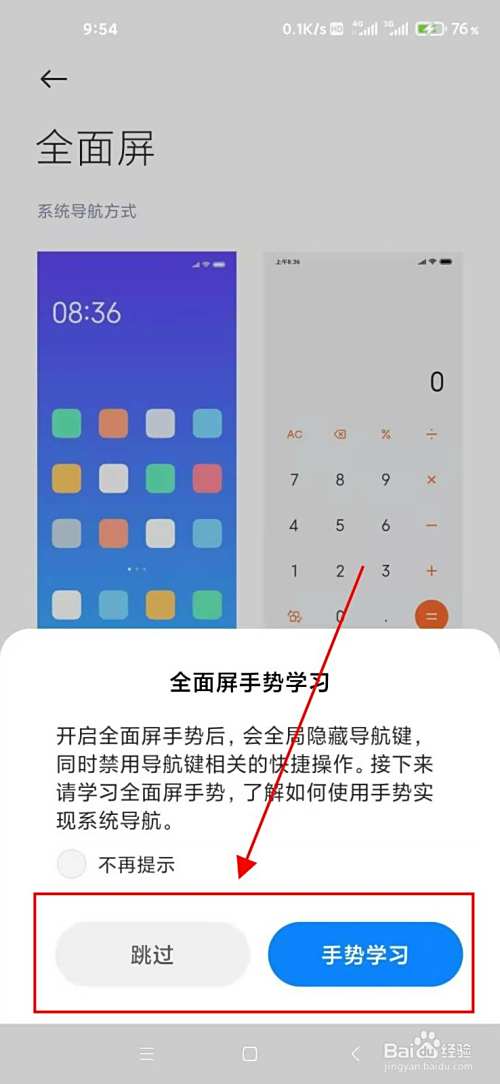 在弹出的窗口中可以选择“手势学习”,也可以直接跳过,到此全面屏设置完成。