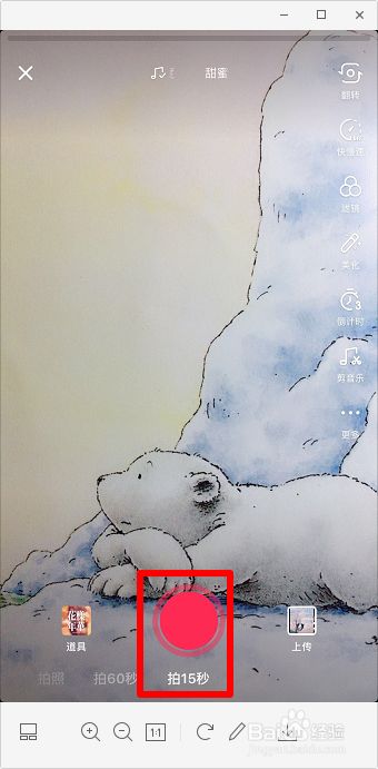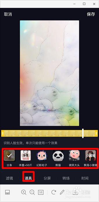点击“道具”,有分身、微笑大头等道具,可以根据需要选择道具,可以调整道具使用的时间,但一次只能加一种道具。