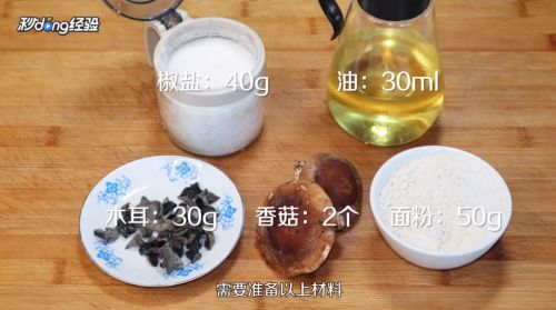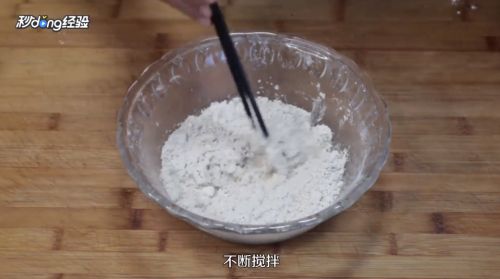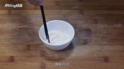 5准备一个空碗,放入少许面粉,加入一勺椒盐和少许盐,搅拌均匀。